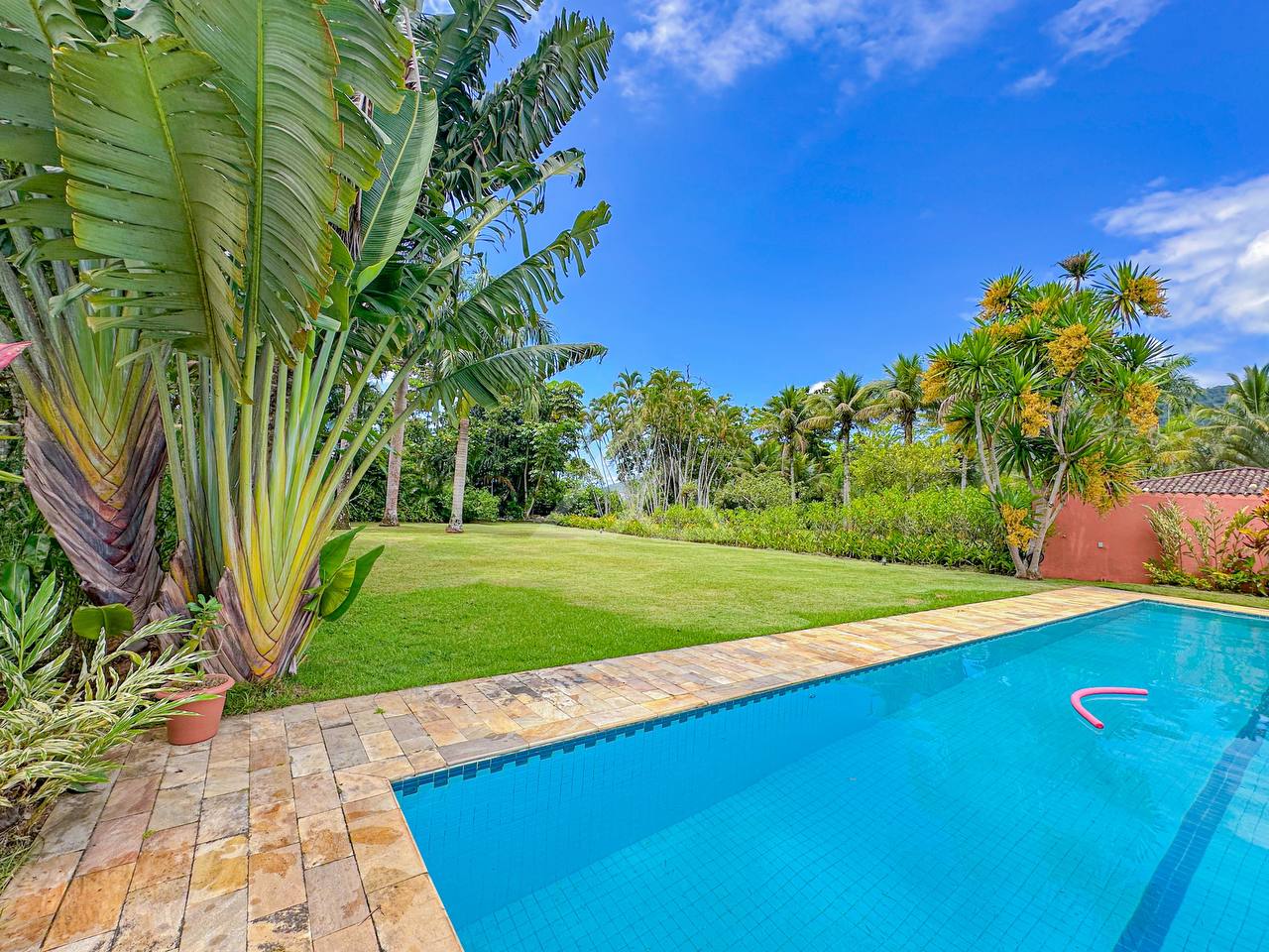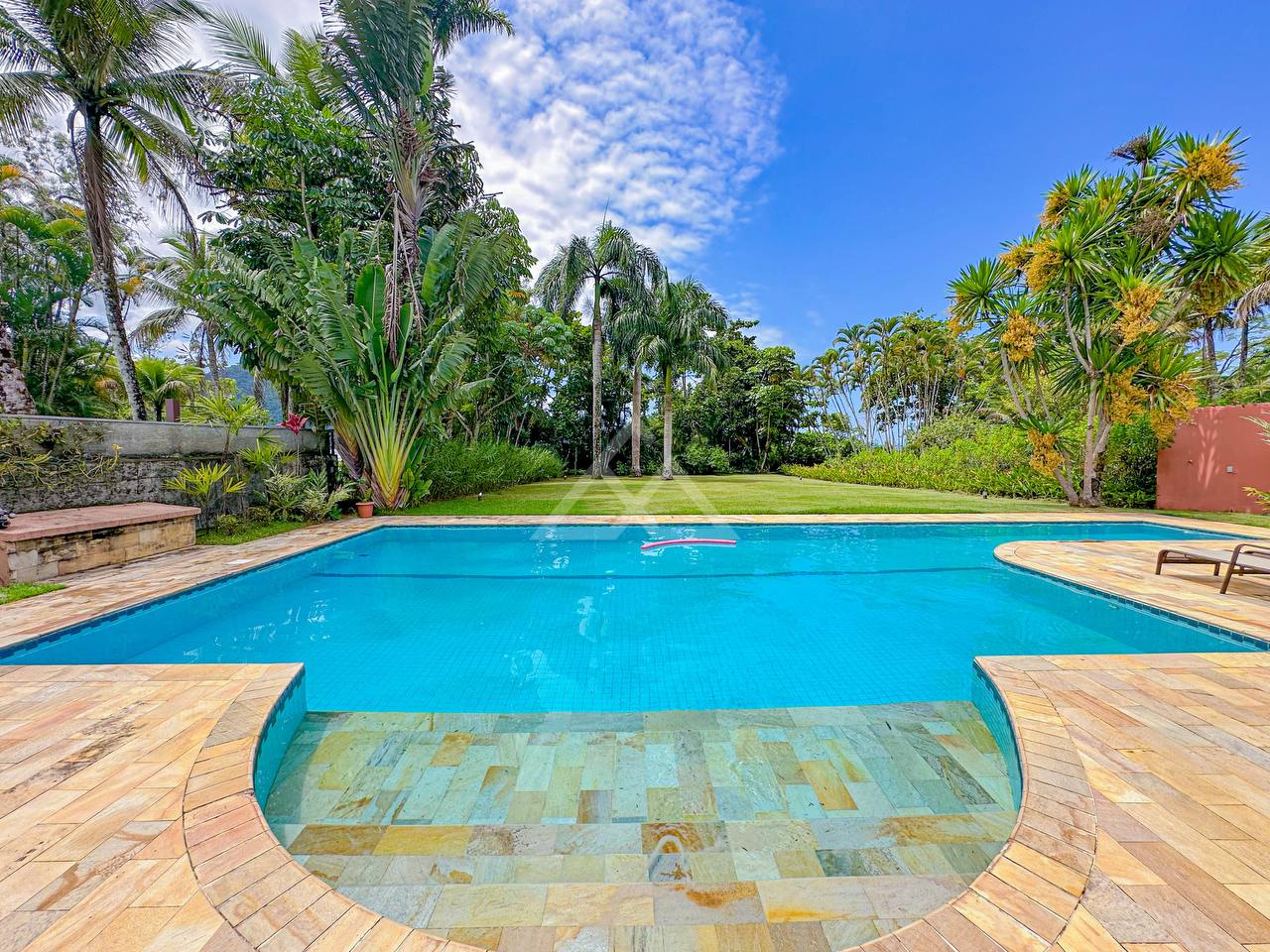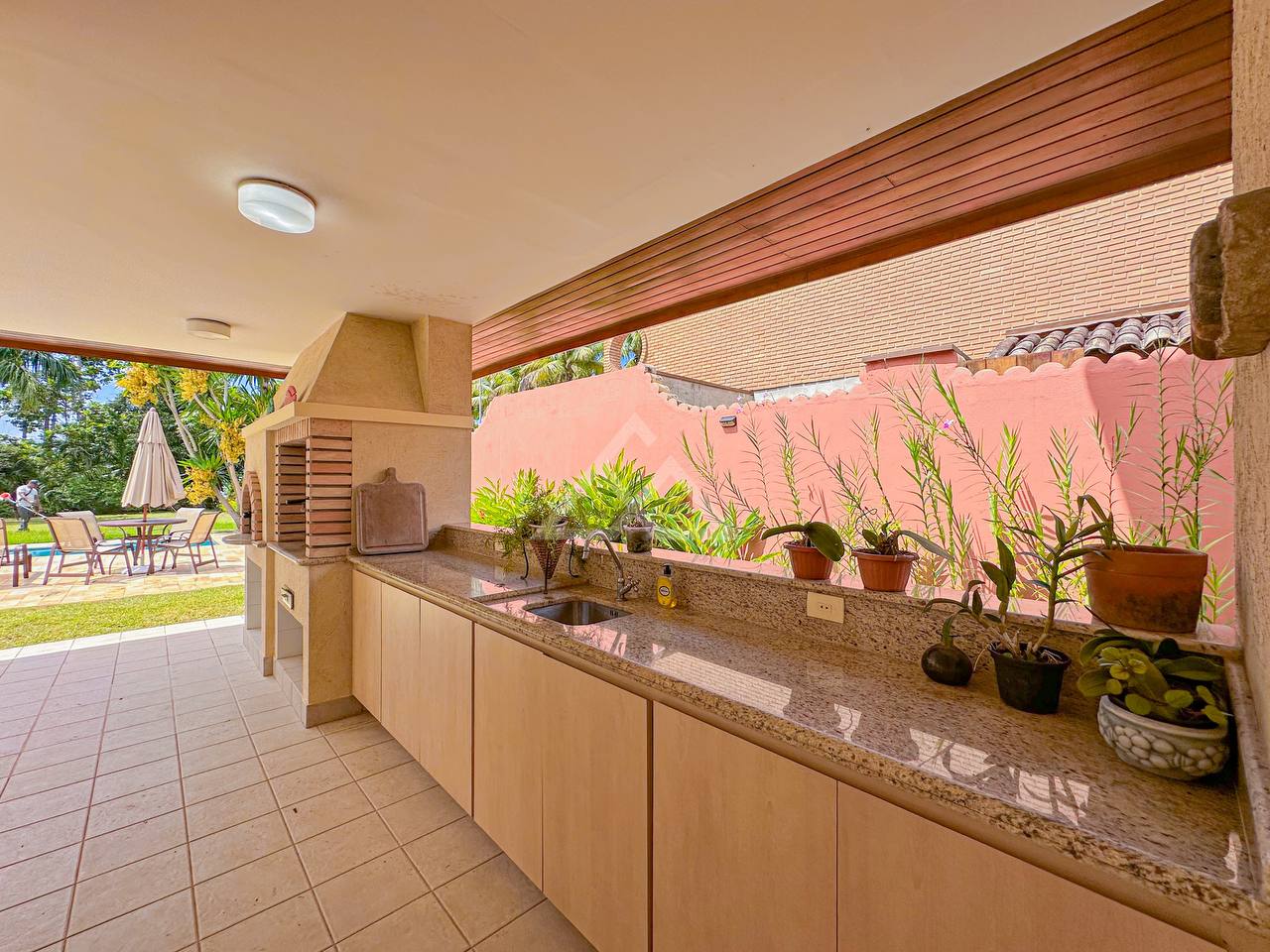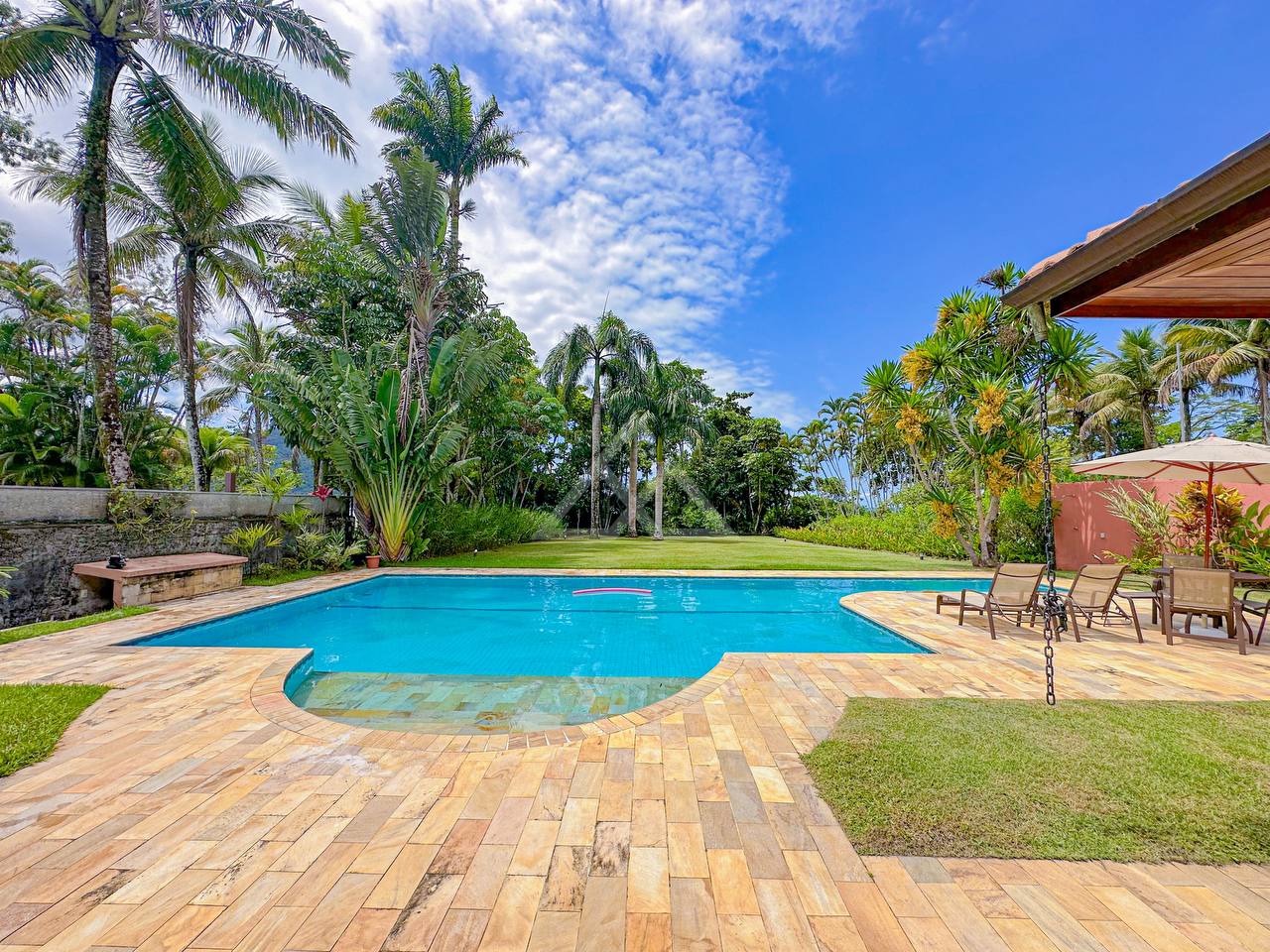 Área gourmet com churrasqueira e forno à lenha, e uma bela piscina com prainha e uma raia de 15m.